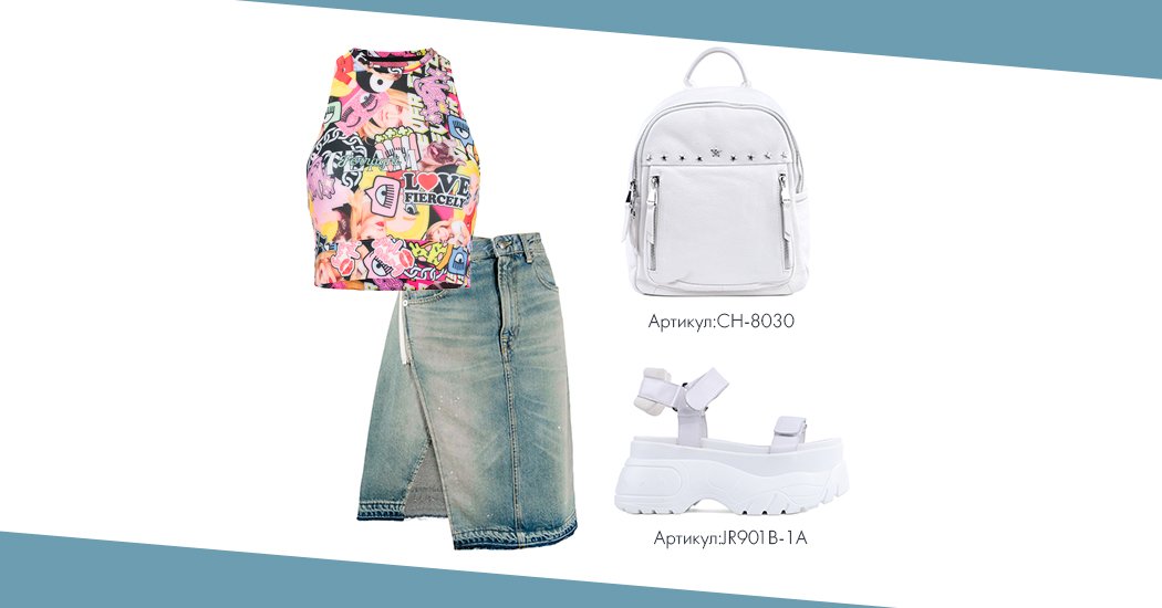 Как носить джинсовую юбку оригинальной конструкции? Найдите свой уникальный стиль с универсальной одеждой и обувью из категории «Sport». Яркий топ, массивные босоножки и рюкзак подойдут.