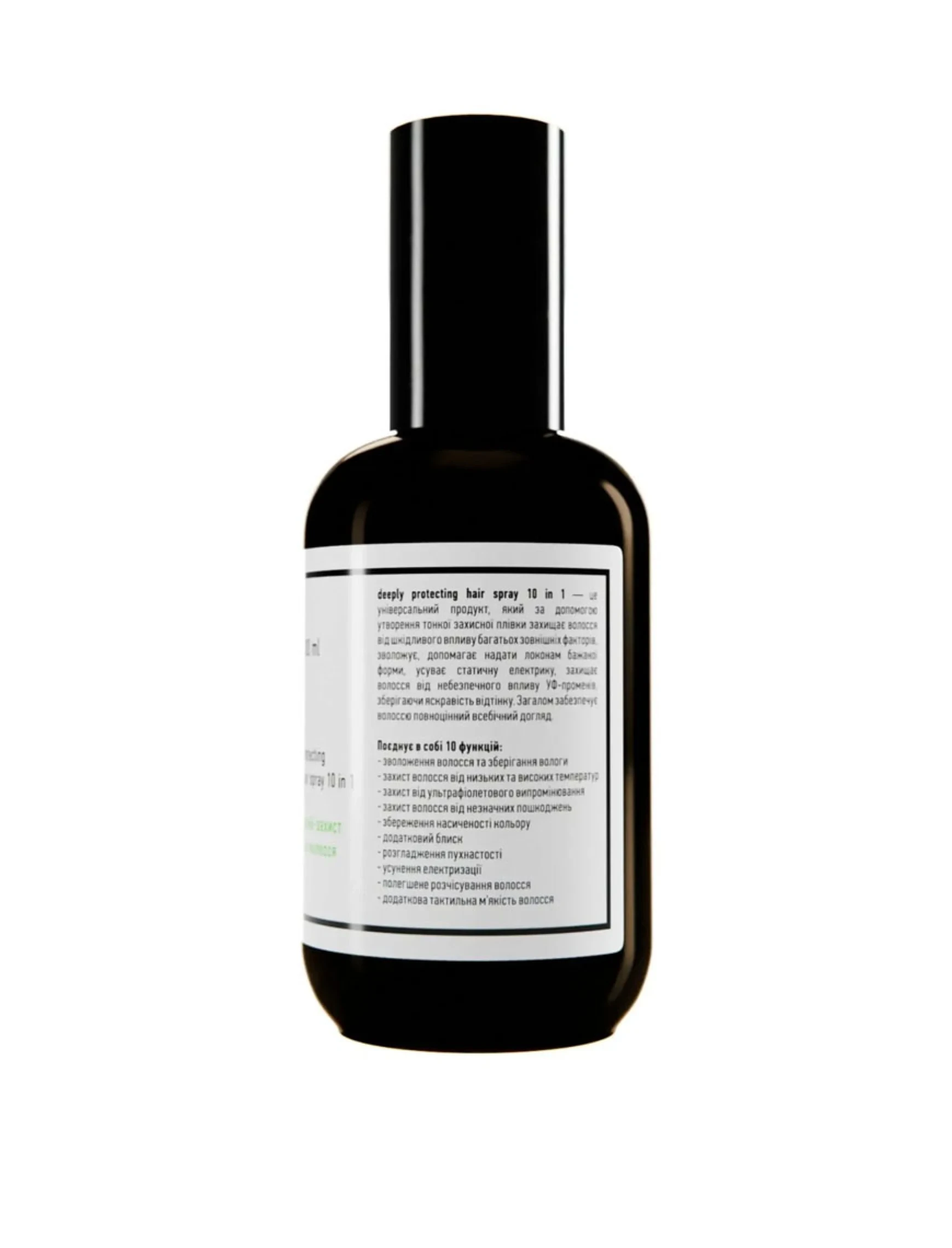 Спрей-захист для волосся 10 в 1 deeply protecting hair spray 10 in 1 - це універсальний продукт, який за допомогою утворення тонкої захисної плівки захищає волосся від шкідливого впливу багатьох зовнішніх факторів, зволожує, допомагає надати локонам бажаної форми, усуває статичну електрику, захищає волосся від небезпечного впливу УФ-променів, зберігаючи яскравість відтінку. Загалом забезпечує волоссю повноцінний всебічний догляд.